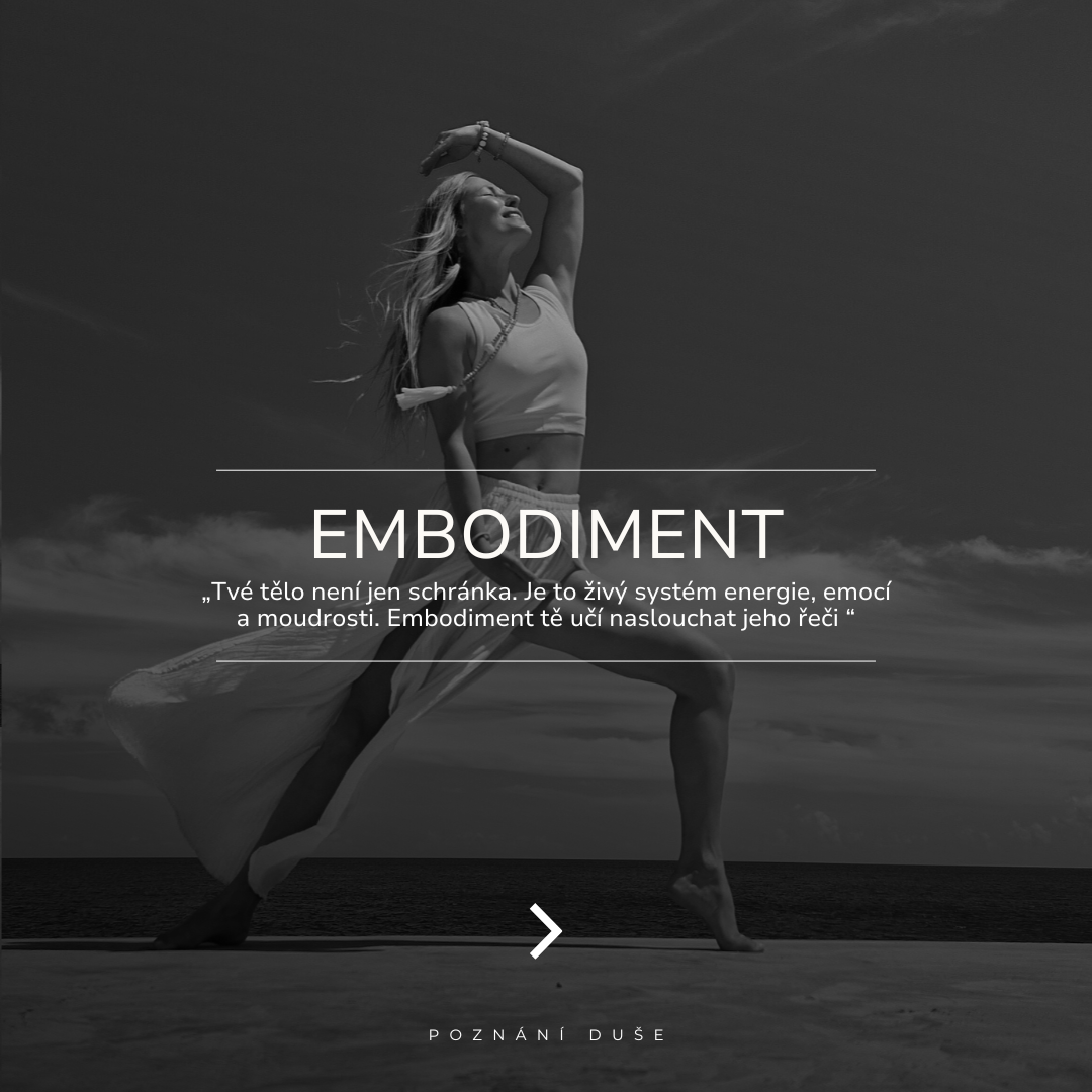 Embodiment (z anglického „tělesnění“) je propojení těla a mysli a vědomé vnímaní, tedy jak tělesné prožitky, pohyby a vnímání ovlivňují naše myšlení, emoce a celkový psychický stav. V praxi jde o uvědomění si vlastního těla a aktivní práci s tělem jako cestou k lepšímu psychickému i fyzickému zdraví. Naučte se pracovat se svou energií a vytvořit si pevné základy.